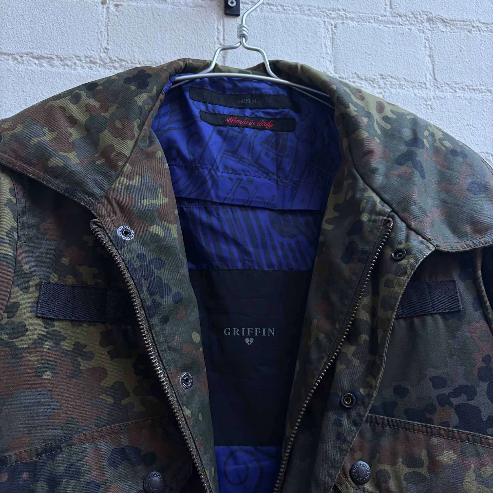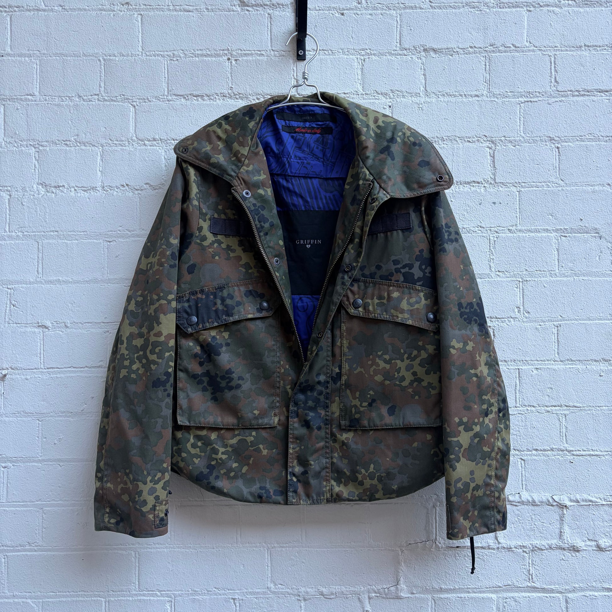 Amazing details to this jacket. Laces to each side of the torso for adjustment, super high collar and warm inner lining. Collar can be worn up or down.