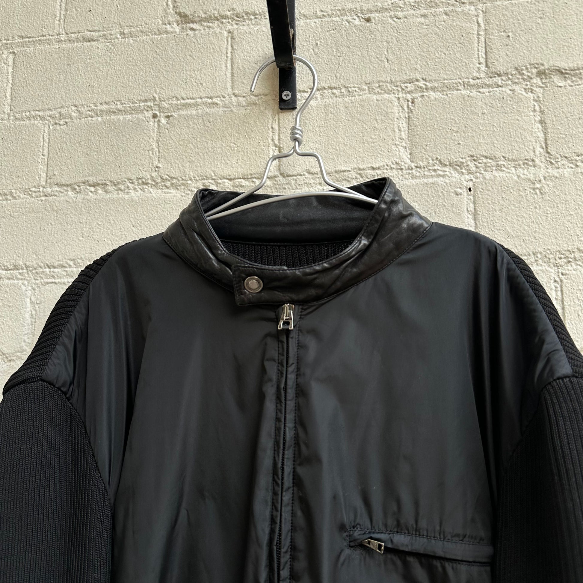 Beautiful zip up, with a nylon / cotton knit blend of panelling, as well as a leather button up collar.